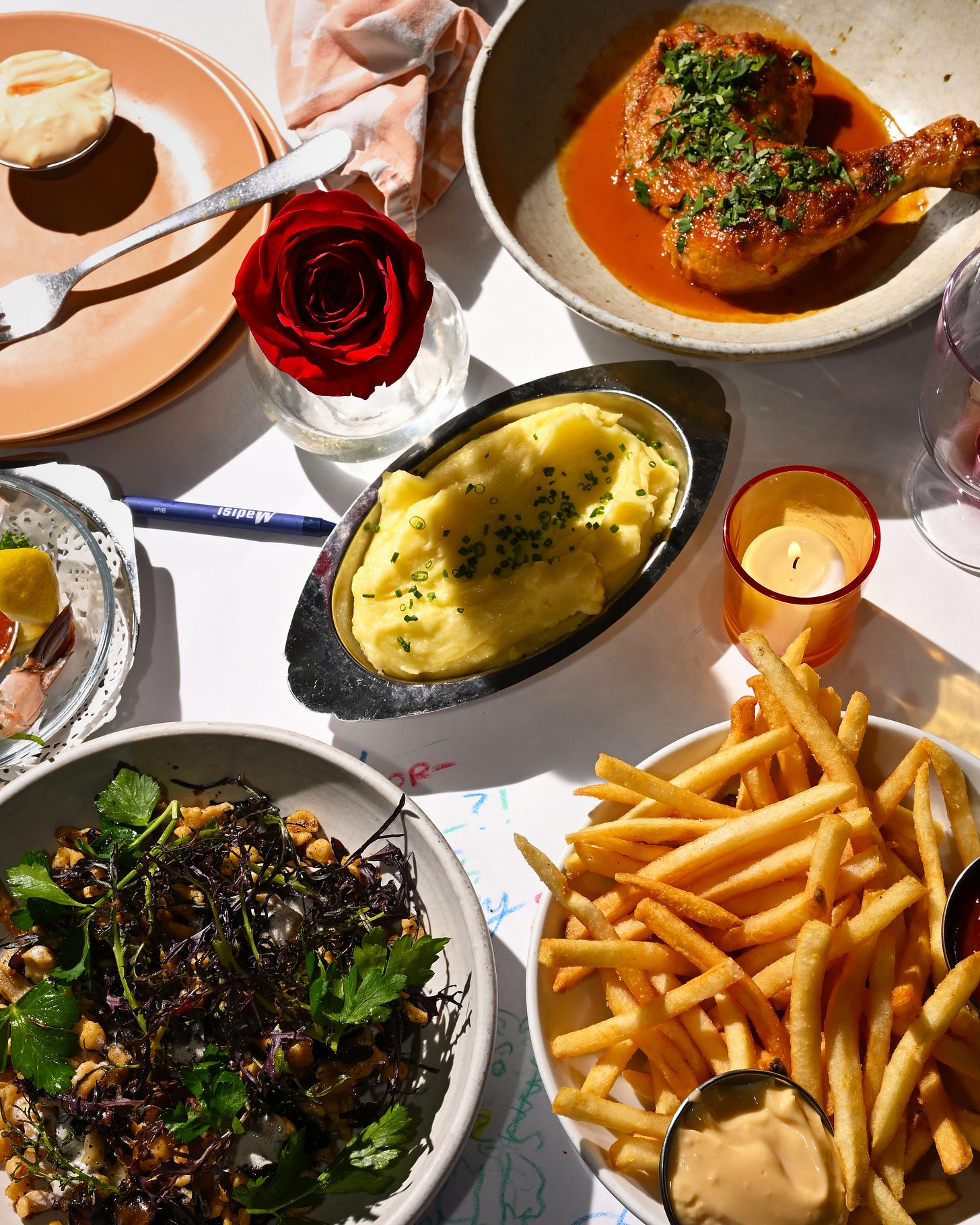 sqirl dinner - came back to update this post my res this week. it’s lovely! worth the wait! amazing branding, ambiance and thoughtful menu. love the mini martini and multiple aiolis (saffron aioli with the sqimps and morita aioli with the fries)